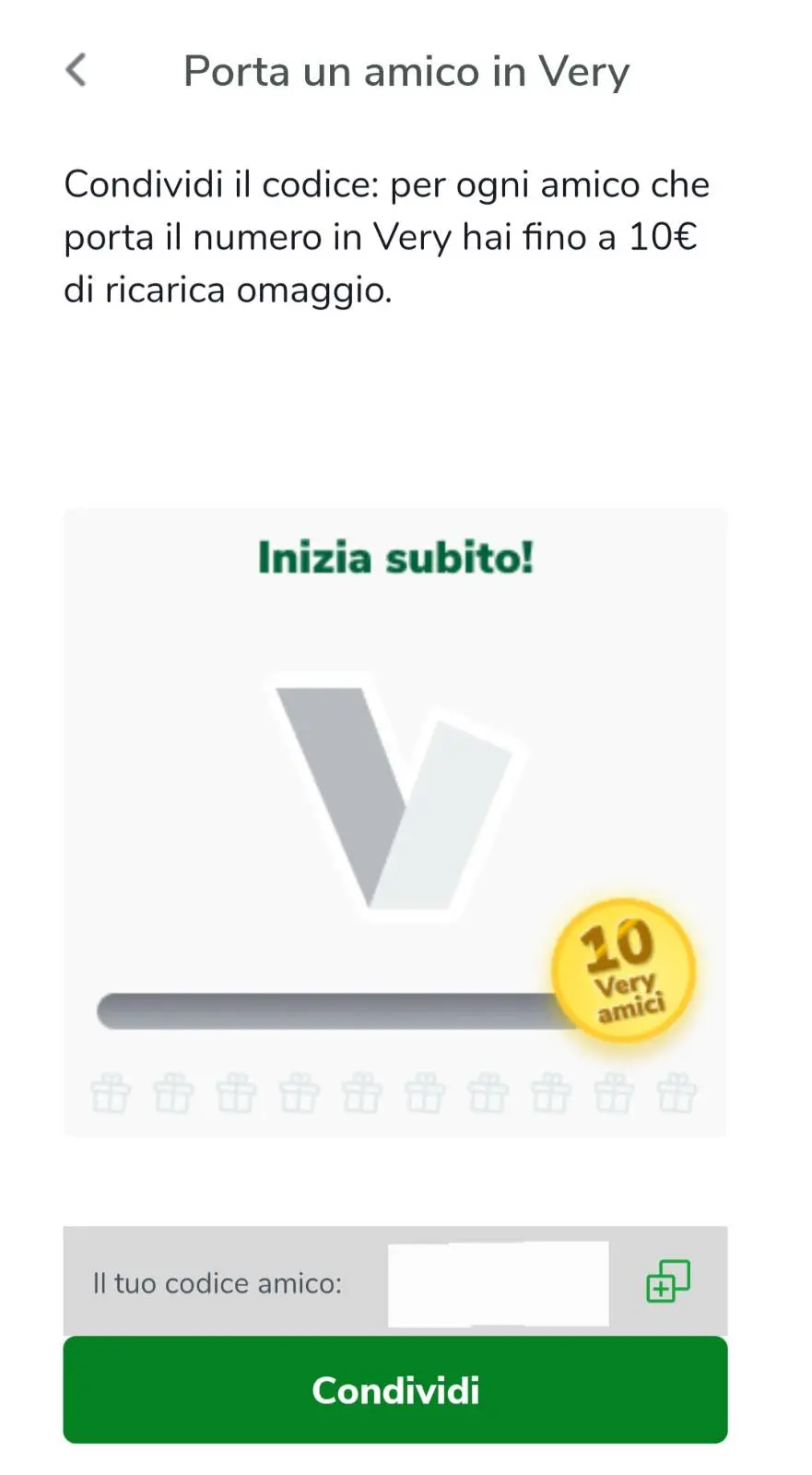- Inizia a invitare: Apri l'app Very Mobile, vai su Offerta > "Porta un amico in Very" e condividi il tuo codice (puoi condividerlo qui su bonuscenter, sezione "Codici della community" in alto nella pagina).