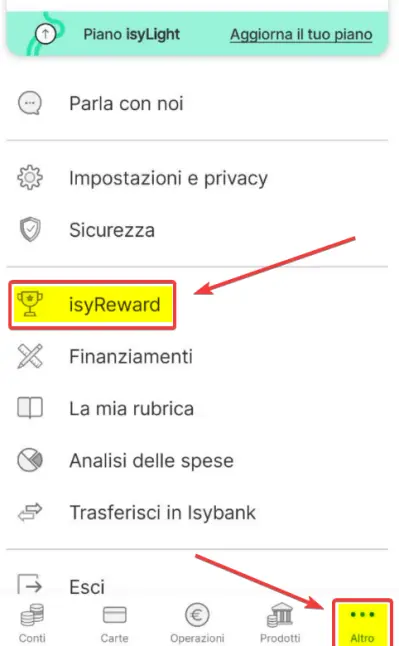 3. Inserimento Codice: Una volta aperto il conto, vai in "Altro → isyReward → inserisci codice". Hai 15 giorni dall'apertura per inserire un codice invito valido.